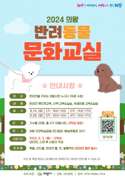 [금요저널] 의왕시는 오는 6월 14일과 28일 왕송호수 잔디광장에서 오전, 오후 3시간씩 총 4차례 반려동물 문화교실을 진행한다고 밝혔다.