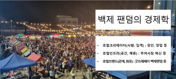 부여군은 중기부 사업에 더해 상권 연계 축제와 굿뜨래페이 AI 고도화를 포함해 전체 72억 규모로 신청해 백제팬덤을 기반으로 40만 경제 관계인구와 6000억 시장 창출을 목적으로 하고 있다.