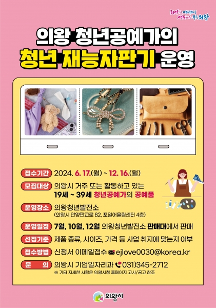 판매할 공예품이 있는 의왕시 거주 또는 의왕시에서 활동하고 있는 청년 공예가라면 누구나 신청할 수 있다.
