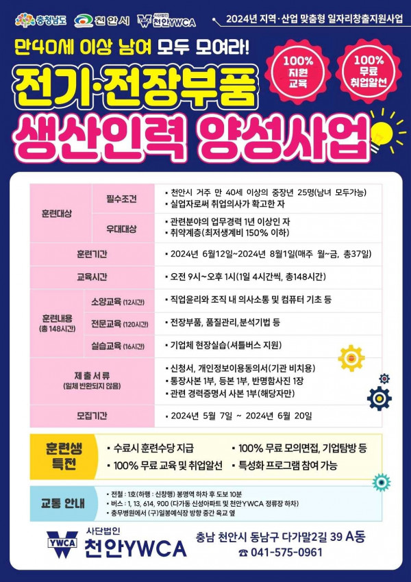 [금요저널] 천안시는 10일까지 ‘전기·전장부품 생산 인력 양성사업’에 참여할 40세 이상 중장년 훈련생 25명을 모집한다.