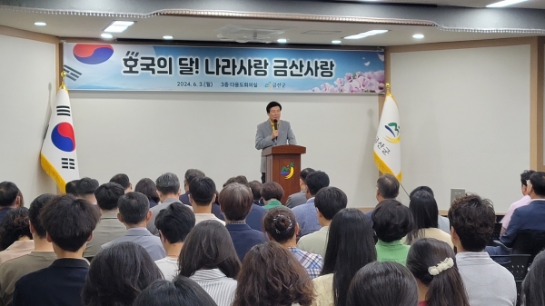 [금요저널] 박범인 금산군수는 3일 군청 다목적회의실에서 열린 월례회의에서 “직원들 간 서로 사랑과 존경으로 인화하는 마음을 갖자”고 말했다.