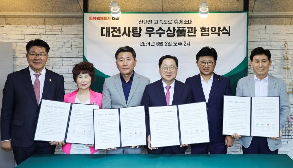 [금요저널] 대전시는 3일 신탄진 고속도로 휴게소 내에‘대전사랑 우수 상품관’을 개관하고 한국도로공사 대전충남본부, 재향군인회 휴게소사업본부, 한밭협동조합연합회 동구지회 3개 기관과 업무협약을 체결했다.