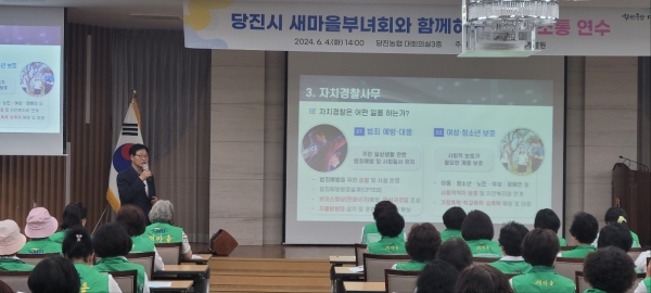 이번 교육은 2024년 상반기 세번째 교육으로 120여명의 당진시 새마을부녀회 회원들을 대상으로 충남자치경찰위원회 김영배 사무국장의 자치경찰제도의 도입 배경 및 성과, 주민 참여 방안과 범죄예방·여성청소년·교통 등 자치경찰사무에 대해 도민 눈높이 맞춤형으로 진행됐으며 주민 의견 청취도 함께 이루어졌다.