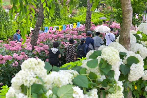 특히 청정 하천인 유구천을 따라 조성된 총 4만 3000㎡의 수변공간에 에나멜수국, 목수국, 앤드리스썸머, 핑크아나벨 등 22종, 1만 6000본에 달하는 수국이 매년 6월이면 장관을 이루고 있다.