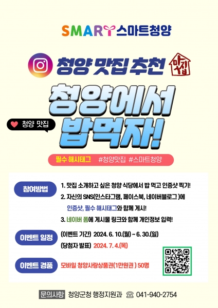 6월 이벤트는 “청양에서 밥먹자” ‘맛집 추천 이벤트’로 10일부터 30일까지 진행하며 맛집 추천 인증사진을 해시태그 2종과 함께 개인 사회관계망에 게시한 후 지정된 네이버 폼에 인증사진 게시물 링크, 개인정보 등을 입력하면 된다.
