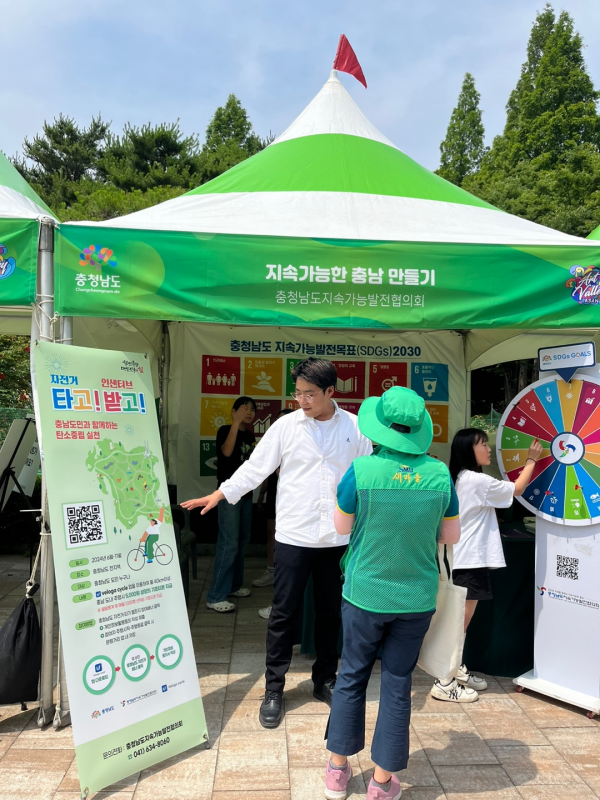 [금요저널] 충남지속가능발전협의회는 제29회 환경의 날을 맞아 아산시 신정호 야외 음악당에서 열린 캠페인에 충남 SDGs 17개 및 ‘자전거 타고 인센티브 받고’자전거 이용 활성화 홍보를 추진했다.