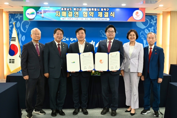 예산군은 7일 국내 7번쨰이자 민선8기 이후 두 번째로 서울특별시 동작구와 자매결연을 체결하고 행정, 경제, 문화, 체육 등 다방면에서 발전을 위해 상호 협력하고 재해·재난 발생시 협조와 지원에 나서기로 했다.