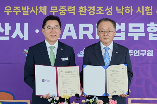 [금요저널] 아산시는 7일 아산그린타워에서 한국항공우주연구원과 우주발사체 무중력환경 조성 낙하 시험 시설 구축을 위한 협약식을 개최했다.