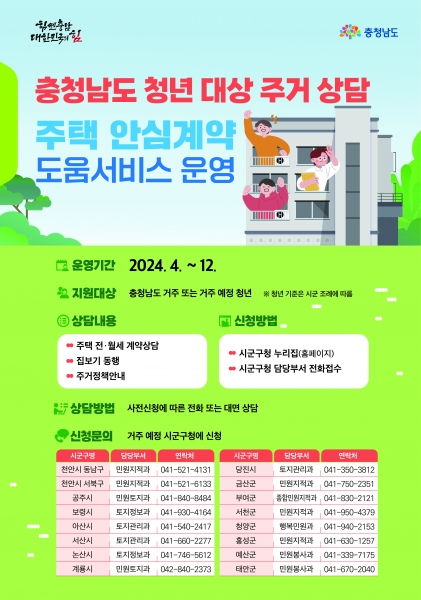 한편 도는 지난 8∼9일 공주대 일원에서 개최한 ‘2024 충청남도 드론 챌린지 대회’에 주택 안심계약 도움서비스 홍보관을 설치하고 도내 많은 청년이 서비스를 제공받을 수 있도록 적극적인 홍보 활동을 추진한 바 있다.