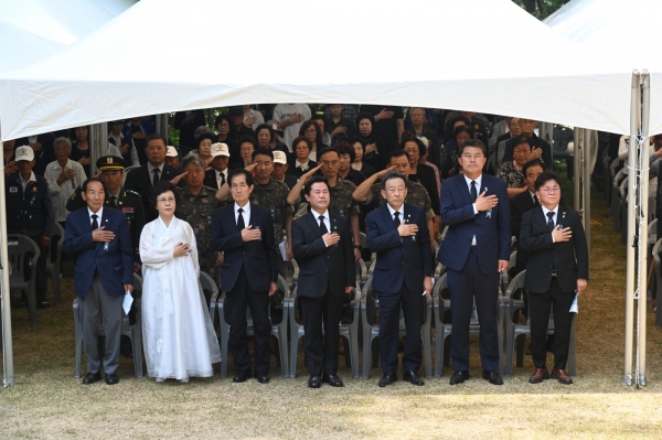 [금요저널] 부여군은 지난 6일 부소산 내 충령사에서 6·25전쟁 74주년인 제69회 현충일을 맞이해 국가유공자 등 보훈 가족, 박정현 부여군수, 부여군의회 의장 및 의원, 충청남도의회 의원, 기관·사회단체장, 공무원 등 400여명이 참석한 가운데 순국선열과 호국영령을 추모하고 감사하는 마음을 기리기 위한 추념식을 엄숙히 거행했다.