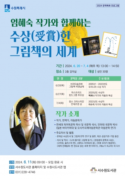 서수원도서관 관계자는 “문학상 수상 도서 번역과 그림책 연구·창작에 능통한 엄혜숙 작가가 진행하는 프로그램”이라며 “지역 주민들이 다양한 문학 작품을 접하고 문학에 대한 이해를 넓힐 좋은 기회가 될 것"이라고 말했다.