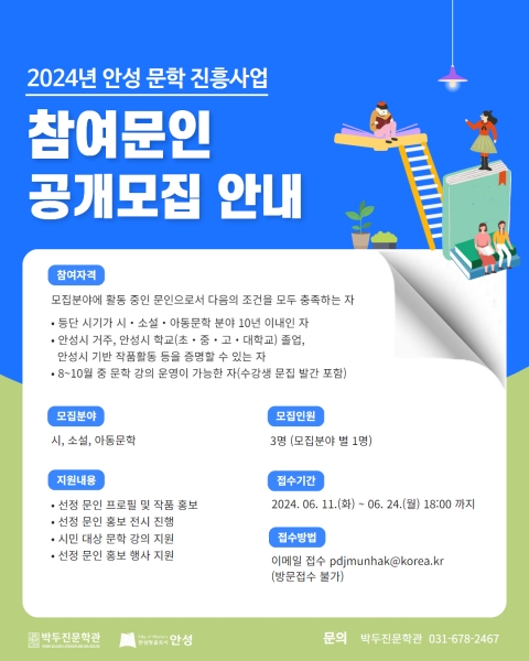[금요저널] 안성시 박두진문학관은 6월 11일부터 6월 24일까지 2주간 ‘2024년 안성 문학 진흥사업’의 참여 문인을 모집한다고 밝혔다.