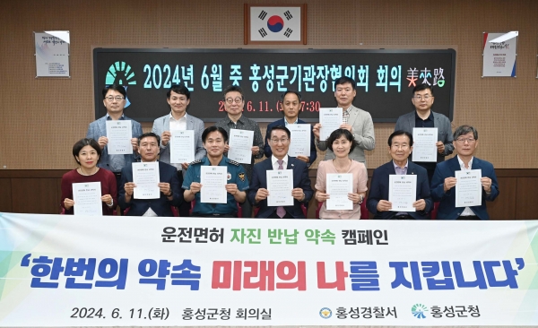 지난 11일 홍성군청 회의실에서 개최된 홍성군기관장협의회에서 이용록 홍성군수를 비롯한 15개 기관장들은 직접 ‘운전면허 반납 서약서’에 서명하며 고위험운전자 면허 반납 분위기를 조성하는 뜻깊은 시간을 가졌다.