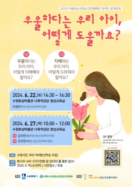 [금요저널] 수원시는 6월 22일 오후 2시 30분, 27일 오전 10시 2회에 걸쳐 수원화성박물관 다목적강당에서 아동·청소년의 우울·자해를 주제로 2024 아동·청소년정신건강캠페인 대국민 공개강좌를 연다.