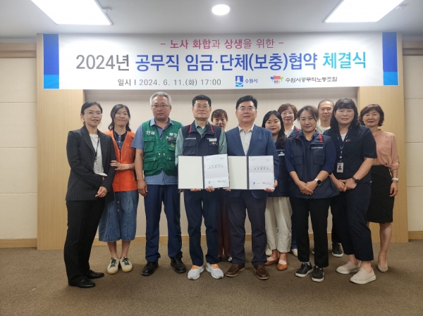 [금요저널] 수원시와 수원시공무직노동조합은 11일 시청 귀빈실에서 ‘2024년 공무직 임금·단체협약’을 체결했다.