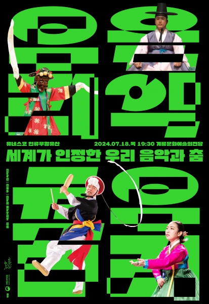시 관계자는 “계룡시민의 문화예술 향유를 위해 국립국악원에서 공연하는 ‘세계가 인정한 우리 음악과 춤’을 유치했다”며 “유네스코 인류무형 유산으로 등재된 우리나라의 전통예술 중 세계가 인정한 우리 음악과 춤을 한 무대에서 볼 수 있는 공연이 될 것”이라고 밝혔다.