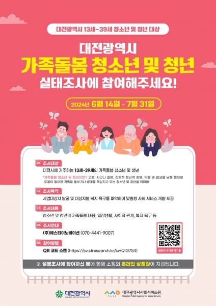 이에 대전시는 2023년 7월‘대전광역시 가족돌봄청년 지원 조례’를 제정했으며 정확한 현황 파악을 통해 체계적인 지원체계를 마련하고자 대전시 사회서비스원 주관으로 이번 실태조사를 진행한다.