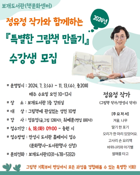 안성시, 보개도서관 책문화센터 2024년 정유정 작가와 함께하는‘특별한 그림책 만들기’수강생 모집