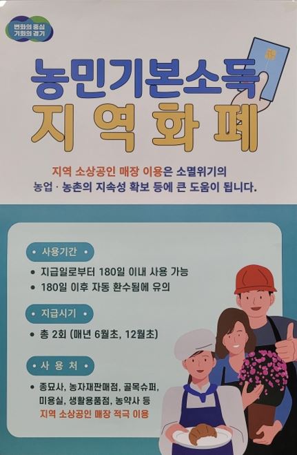 농민기본소득은 농민의 생존권을 보장하고 농업과 농촌의 공익적 가치에 대한 사회적 보상을 목적으로 지난 2021년부터 시행하고 있으며 농민 개인에게 매달 5만원씩 총 60만원을 지역화폐로 지급한다.