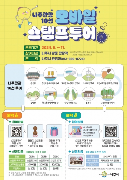 14일 나주시에 따르면 관광 10선에 포함된 관광지 3곳 이상을 방문한 관광객이 스탬프 미션을 인증하면 추첨을 통해 소정의 나주사랑상품권을 증정한다.