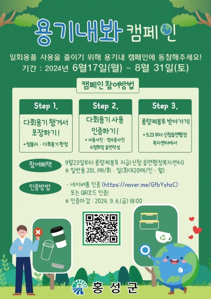 [금요저널] 홍성군이 6월 17일부터 8월 31일까지 ‘용기내봐 캠페인’을 펼쳐 1회용품 사용 절감과 다회용기 활성화에 나선다.
