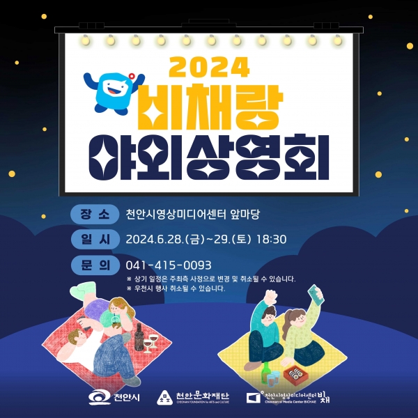 [금요저널] 천안문화재단 천안시영상미디어센터가 ‘2024 비채랑 야외 상영회’를 오는 28일부터 29일까지 이틀간 천안시영상미디어센터 앞마당에서 운영한다고 밝혔다.