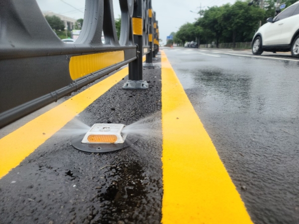 쿨링&클린로드는 도로 중앙선에 작은 사각형 모양으로 공공하수처리장에서 공급되는 재이용수를 도로면에 자동으로 분사하는 자동 살수시스템이다.