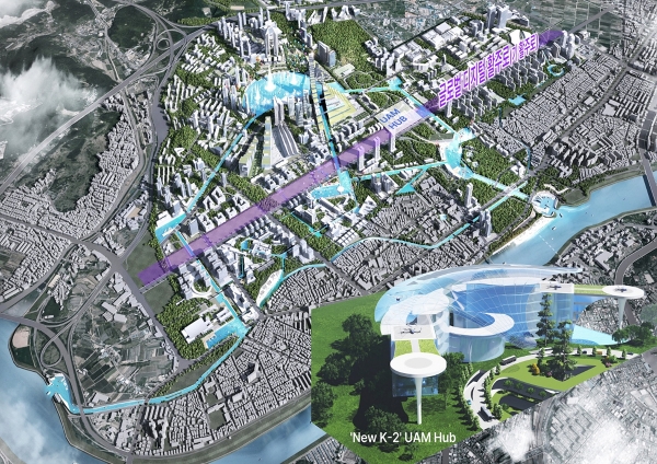 UAM 복합환승센터는 지상 6층, 지하 5층 규모로 UAM, KTX, 도시철도, 수상교통, 버스터미널 등 교통허브 기능 수행