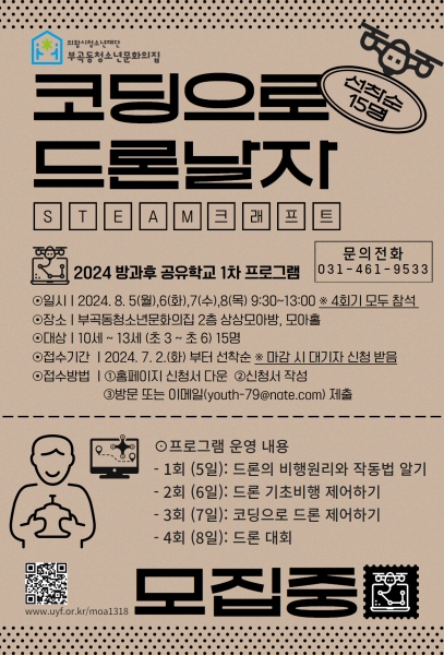 [금요저널] 의왕시청소년재단 부곡동청소년문화의집에서 2024 방과후 공유학교 STEAM크래프트 1차프로그램 ‘코딩으로 드론날자’참가자를 모집한다.