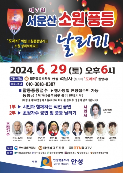 [금요저널] 안성시는 오는 29일 오후 6시경 석남사 경내 특설무대에서 ‘2024년 제7회 석남사 산사음악회 및 소원풍등날리기’ 행사를 개최한다고 밝혔다.