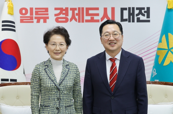 21일 오전 대전시청에서 자매도시 중국 난징시 훠휘핑(霍慧萍) 부시장을 접견하고 양 도시 국제협력 강화와 대전 0시 축제 초청 등에 대해 환담했다