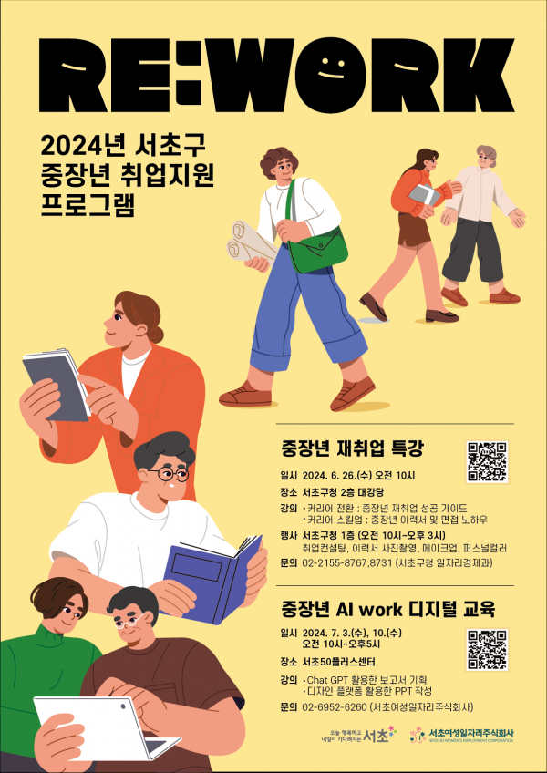 중장년 재취업 특강과 중장년 AI work 디지털 교육에 참여를 원하는 경우, 홍보 포스터의 QR코드 또는 서초여성일자리주식회사 홈페이지 팝업창을 통해 신청할 수 있다.