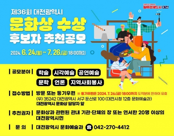 [금요저널] 대전시는 문화예술 창달과 지역사회봉사에 기여한 공로가 현저한 시민을 대상으로 24일부터 7월 26일까지‘대전광역시 문화상’후보자를 공모한다.