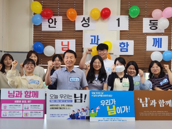 ‘님과함께’는 공직사회에서 공식적으로 불려지는 “주무관”, “팀장” 등의 호칭 대신 이름 뒤에 ‘님’이라는 호칭을 사용해 보는 것을 의미하고 청·소·존 데이는 청렴, 소통, 존중 데이의 줄임말로써 매월 셋째주마다 안성1동 자체적으로 주제를 정해 부서원 간 소통과 화합의 시간을 갖는 것을 말한다.