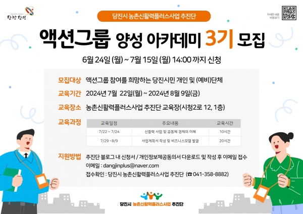 [금요저널] 당진시 농촌신활력플러스사업 추진단에서 ‘2024년 액션그룹 양성 아카데미 3기’ 교육생을 오는 15일까지 모집한다.