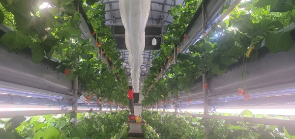 [금요저널] 논산시가 논산형 스마트팜의 일환으로 추진한 2023년 창고형 식물공장은 버섯재배사를 개조해 딸기 수직재배를 추진한 것으로 작년 3월 딸기 정식 후 올해 6월 현재까지 딸기를 생산하고 있다.