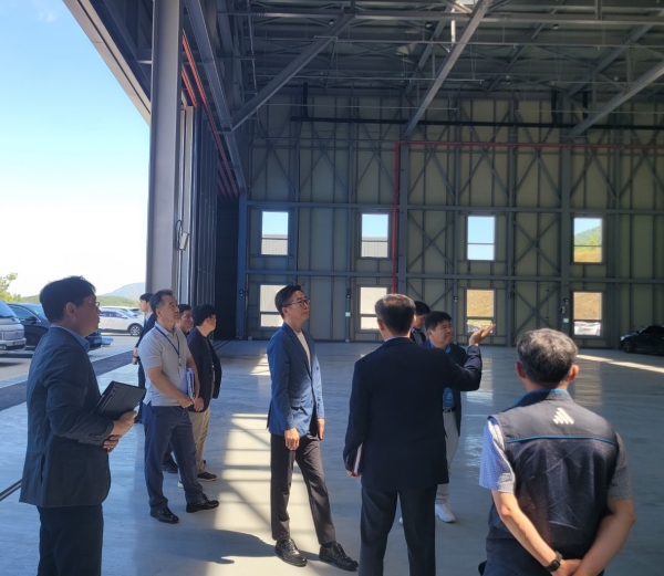 권혁민 충남소방본부장(사진 가운데)이 26일 119복합타운 신축현장을 방문해 119항공대 격납고 시설을 점검하고 있다.