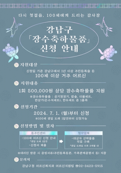 사업 추진을 위해 지난해 11월 ‘서울시 강남구 장수축하금 등 지원에 관한 조례’를 제정하고 보건복지부와 여러 차례 세부 지원 방안을 협의한 끝에 물품을 지원한다.