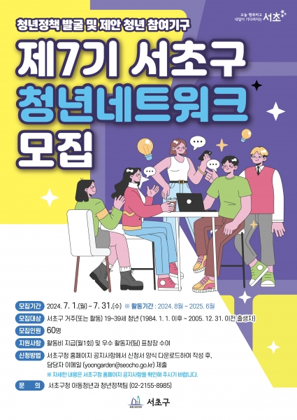 7월 1일부터 31일까지 청년정책 발굴 및 제안 참여기구 ‘서초구 청년네트워크’ 7기 활동위원 60명 모집