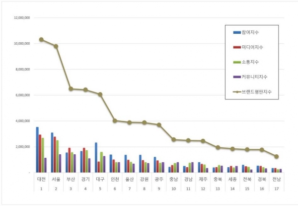 1위를 차지한 대전 브랜드는 참여지수 3,526,671 미디어지수 2,938,163 소통지수 2,703,644 커뮤니티지수 1,147,996이 되면서 브랜드평판지수 10,316,474로 분석됐으며. 지난 5월 브랜드평판지수 6,563,149와 비교 하면 57.19% 상승했다.