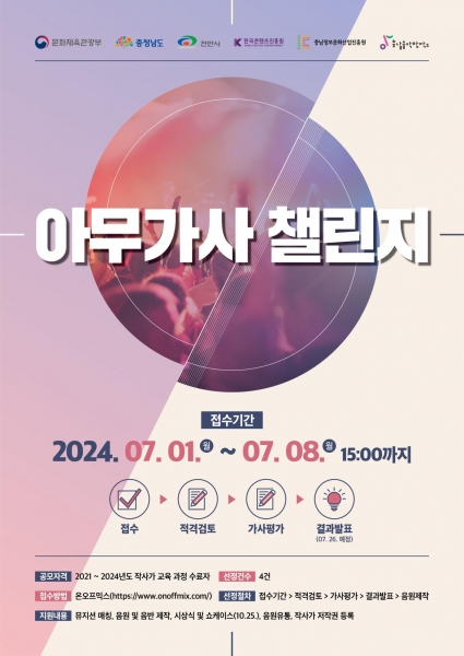 공모전은 2021년부터 2024년까지 충남음악창작소에서 작사가 교육과정 수료생이면 누구나 참여할 수 있으며 오는 8일 오후 3시까지 온오프믹스를 통해 접수하면 된다.