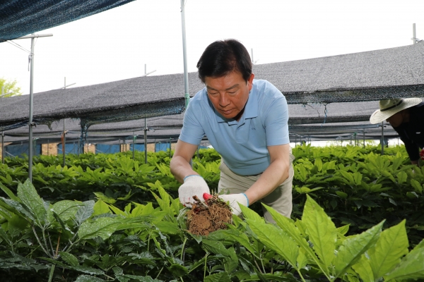 이날 박 군수는 현장을 살피고 농산물우수관리 인삼 생산 유통 활성화 및 애로사항에 관한 의견을 청취했으며 제초 작업 등 일손을 도왔다.