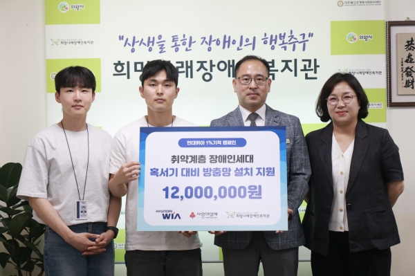 전달된 지원금 1,200만원은 현대위아 임직원들이 자발적으로 급여의 1%를 모아 지역사회를 돕는 ‘1% 기적’ 모금 활동으로 마련됐으며 혹서기 열악한 주거환경에 처한 의왕시 장애인 가구 32세대를 대상으로 한 방충망 설치 지원 사업에 사용될 예정이다.