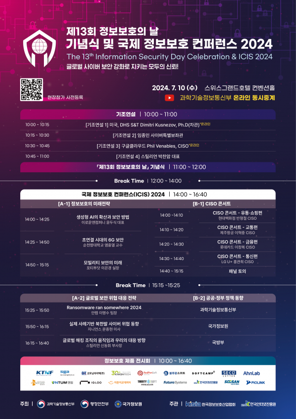 특히 기념식 행사 전에 미 국토안보부 차관과 구글 클라우드 CISO를 비롯한 국내외 저명인사의 기조연설을 통해 ‘글로벌 사이버보안 협력’과 ‘국내외 정보보호 신기술동향’ 등이 소개될 예정이다.