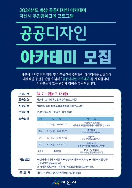 [금요저널] 아산시가 충남연구원 공공디자인센터에서 추진하는 ‘충청남도 공공디자인 아카데미’에 선정돼 1일부터 참여자를 모집한다.