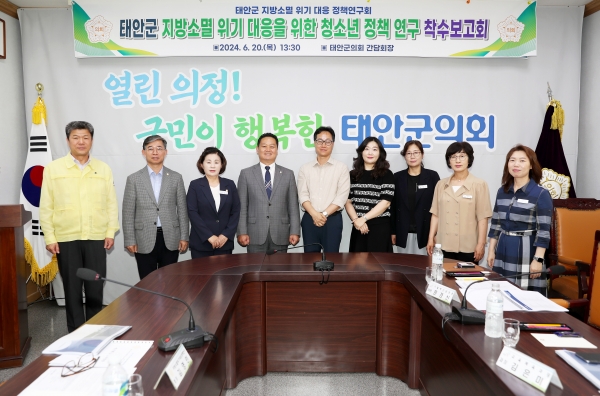 [금요저널] 태안군의회 의원연구단체 “태안군 지방소멸 위기 대응 정책연구회”는 지난 20일 태안군의회 간담회장에서 태안군의 지방소멸 위기 대응을 위한 청소년 정책 연구용역 착수보고회를 개최했다.