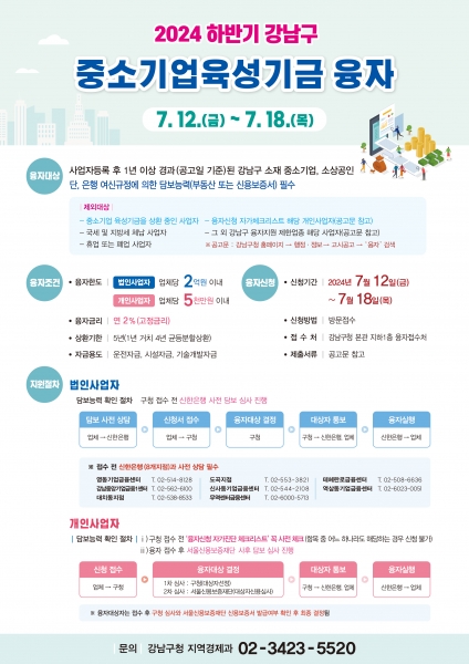 신청 기간은 7월 12일부터 18일까지이며 희망하는 업체는 융자신청서 사업계획서 등을 구비해 구청 본관 지하 1층 융자접수처로 방문 신청한다.