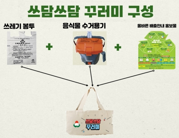 쓰담쓰담 꾸러미는 종량제봉투 10L, 음식물 수거용기 3L, 올바른 쓰레기 배출 방법 홍보문, 업사이클링 에코백으로 구성된다.