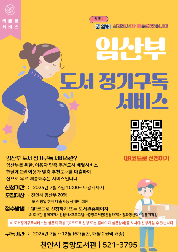 [금요저널] 천안시 중앙도서관은 저출산 시대 임산부를 위한 내 생애 첫 도서관으로 ‘도서 정기구독 서비스’를 운영한다고 밝혔다.