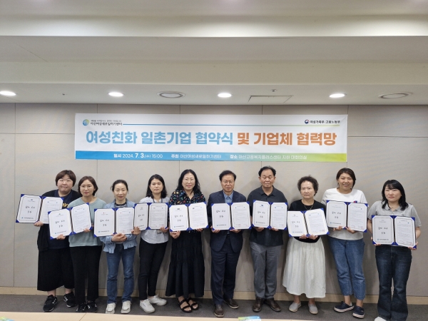 [금요저널] 아산시 여성새로일하기센터는 지난 3일 여성 친화적 기업문화 조성과 경력단절 여성 등의 안정적 고용 유지를 위해 11개 업체와 ‘여성 친화 일촌기업’ 협약을 체결했다.